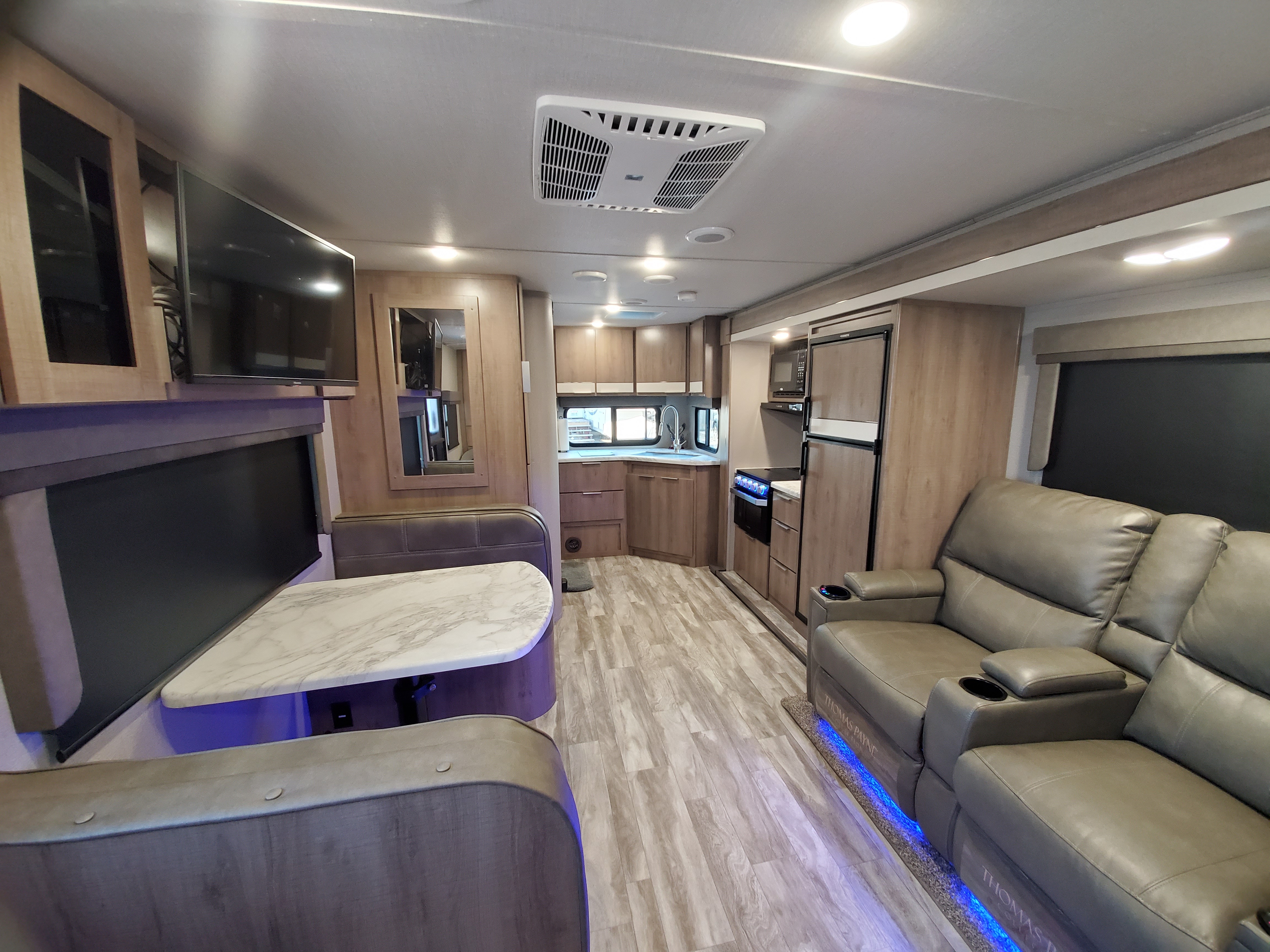 14 electric awning experience new adventures with inside features to make you feel just like you are at home such as ample counter space in the full kitchen a cozy theater dinette with removable table to watch the high definition led tv on a swing arm and your own bedding.